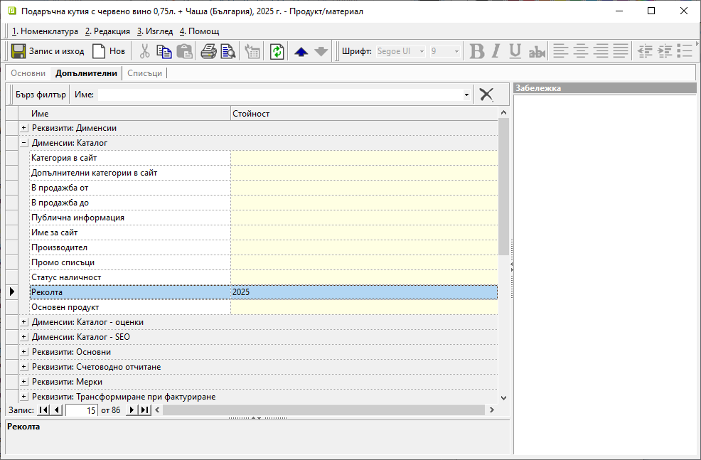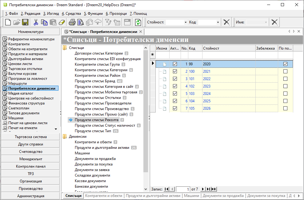 Настройките се базират на Номенклатури » Потребителски дименсии и дефиниране на избрани реквизити в Номенклатури » Продукти и материали.