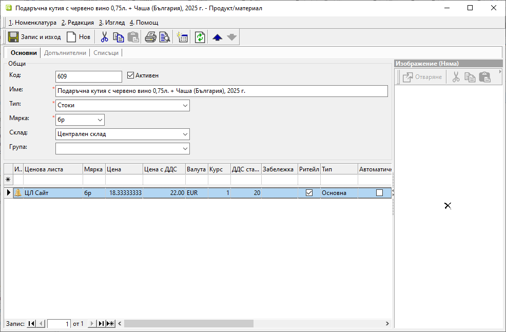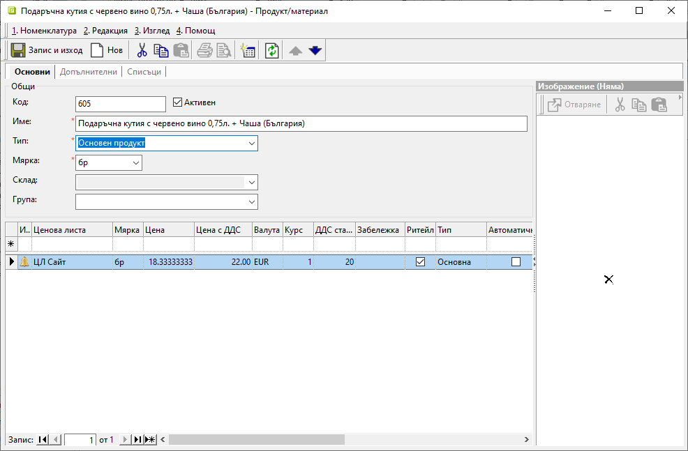 В Номенклатури » Продукти и материали се въвеждат отделни записи с основен продукт и всички негови разновидности.