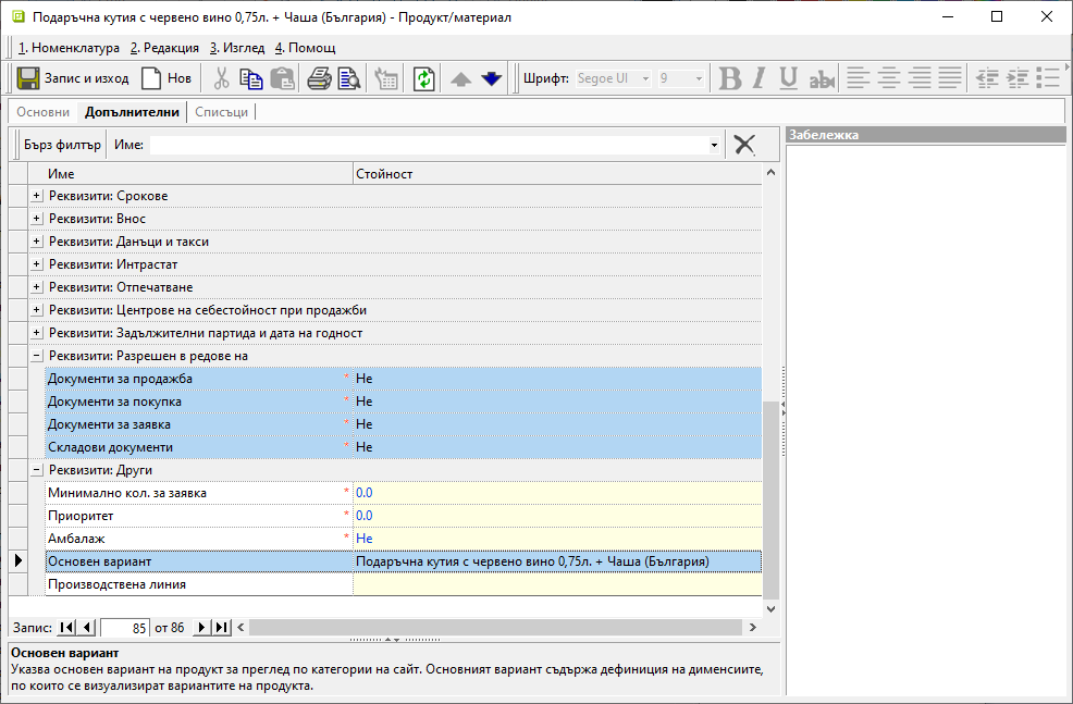 Задължително в Реквизити: Разрешен в редовете на се маркира опция Не за всички типове документи. С това системата не допуска основният продукт да участва при генерацията им.