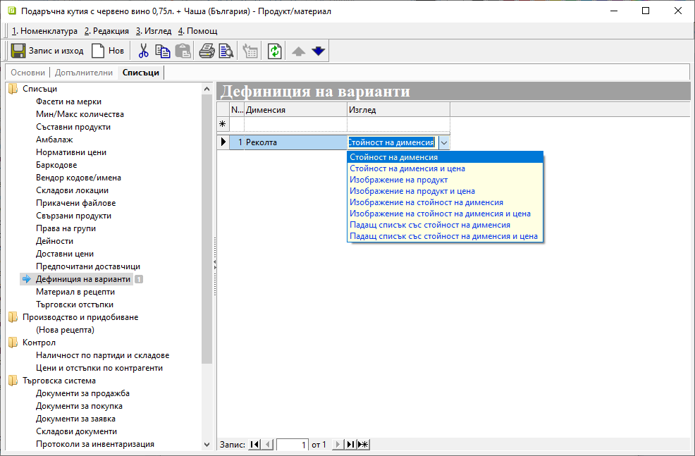 В последния раздел Списъци » Дефиниция на варианти се посочва дименсията, която се отнася към възможните варианти за продукт-основен. Чрез реквизит Изглед се дефинира начинът, по който вариантите са представени на сайта.