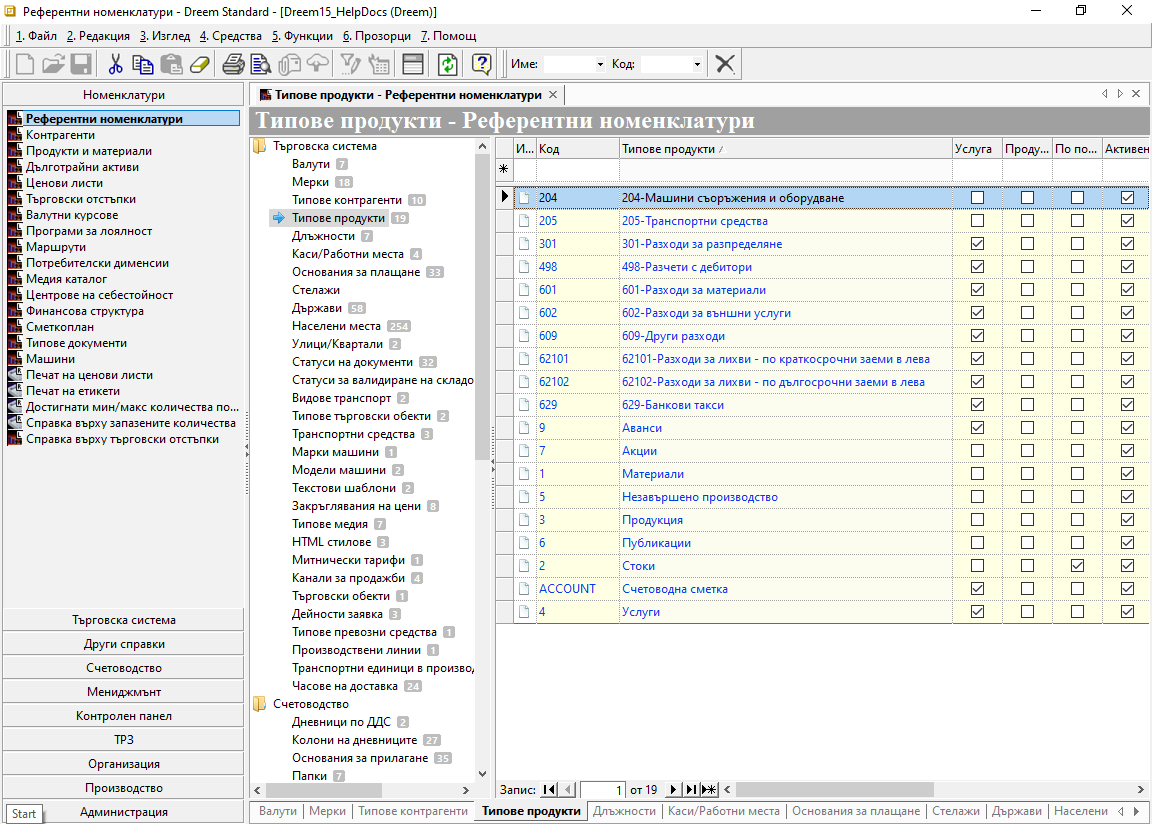 Част от тези номенклатури са: Мерки, Типове контрагенти, Типове продукти, Длъжности, Каси/Работни места, Основания за плащане.