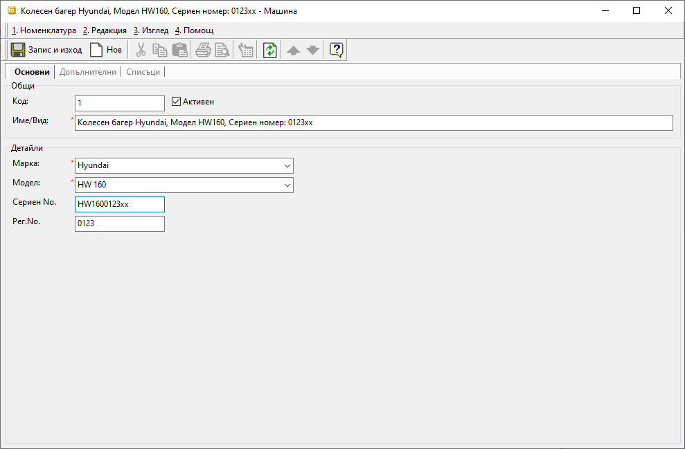 Задължително за попълване е полето Име/Вид с избрано наименование за машината.