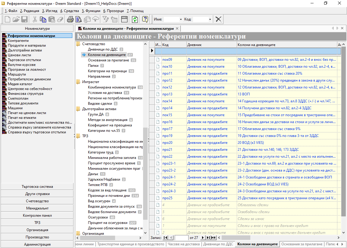 Колони на дневниците - поле с наименование на колона, участваща в избрания на реда вид дневник;