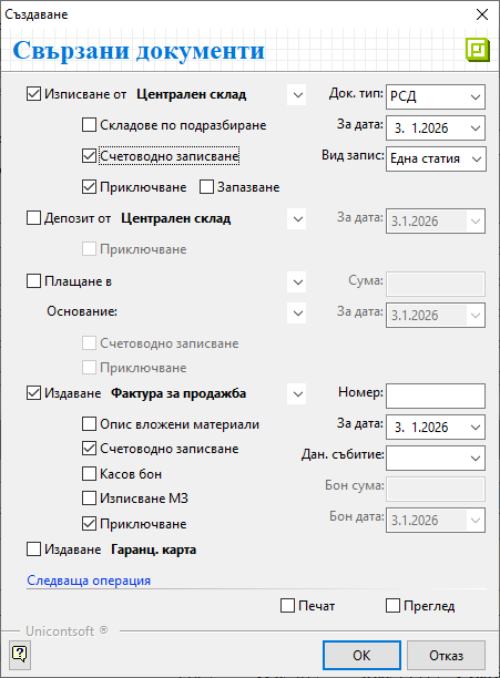 Ок бутонът потвърждава маркираните опции. Системата генерира избраните свързани документи и валидира покупката.