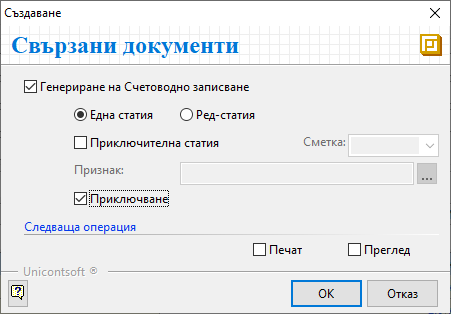 Приключване - при поставена отметка системата генерира счетоводния документ и автоматично го приключва;