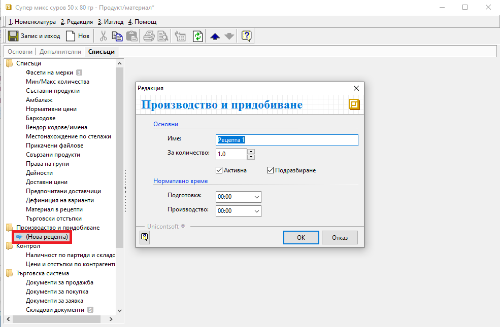 Настройката е достъпна от форма за редакция на избрания продукт в раздел Списъци || Производство и придобиване. За добавяне на първа рецепта в продукта се избира опцията (Нова рецепта). Това отваря форма за редакция Производство и придобиване.