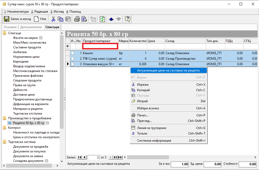 Себестойност - Колоните Цена, ПДЦ (Последна доставна цена без ДДС) и СПЦ (Среднопретеглена цена в склада) се обзавеждат от системата. По желание се маркира един, няколко или всички редове от списъка и с десен бутон на мишката се избира Актуализация цени на съставки на рецепта.