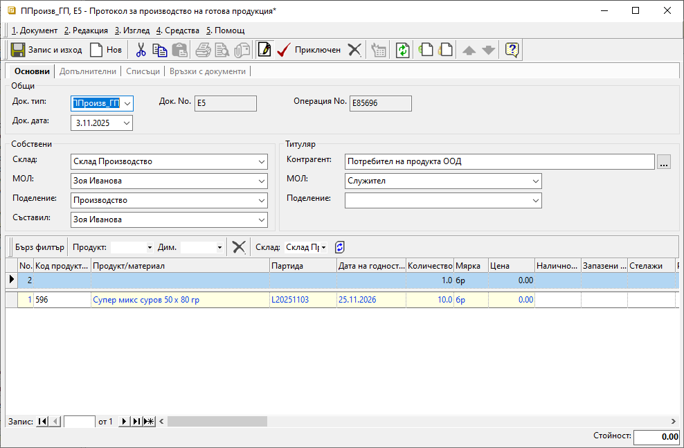 С бутон ОК избраните опции се потвърждават и данните се валидират. С това готовата продукция се заприходява в съответния склад.