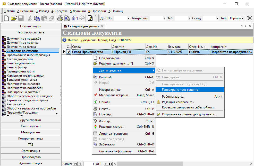 Списък със складови документи чрез десен бутон върху ППроизв_ПФ и избор на Други средства || Генериране през рецепта;