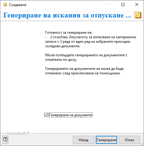 Системата информира какви документи е в готовност да създаде. Действието може да бъде потвърдено с поставяне на отметка при Генериране на документи и бутон [Генериране].