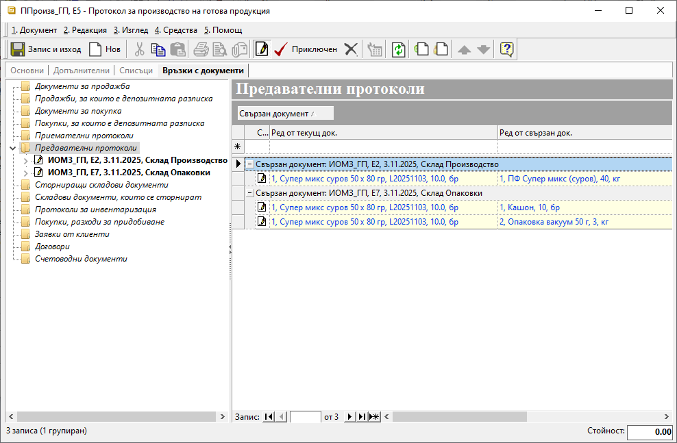 ИОМЗ - Новосъздаденият документ ИОМЗ е достъпен от списък с документи или от раздел Връзки с документи на протокола за производство.