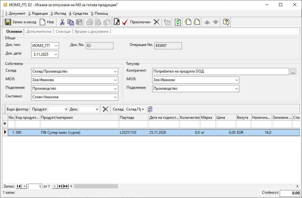 Документът се приключва след генериране на ИОМЗ-Искане за отпускане на МЗ и потвърждаване на вложените суровини.