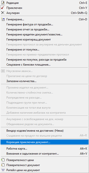 Друг вариант за редактиране е използването на вградения инструмент Корекция приключен документ. Той се намира в меню Средства от форма за редакция на документ.