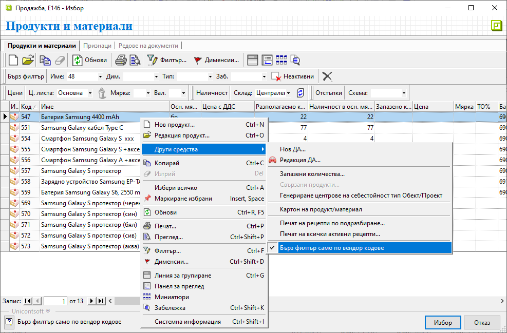 Настройката е достъпна от списък Продукти чрез десен бутон на мишката и опция Други средства » Бърз филтър само по вендор кодове. Опцията може да бъде активирана/деактивирана по всяко време. Тя е отделна за всеки от списъците с продукти, според това в коя функционалност е отворен (Номенклатури, Документи за продажба, Складови документи и т.н.)