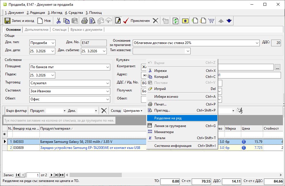 Опцията е достъпна от форма за редакция на продажба. Маркира се продукт и с десен бутон се избира Разделяне на ред.