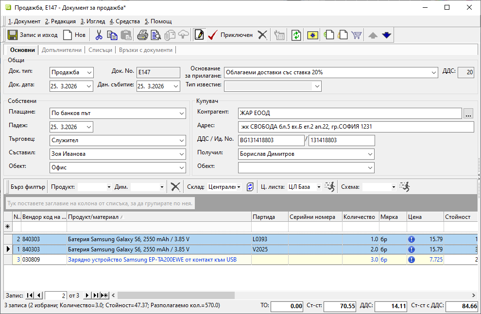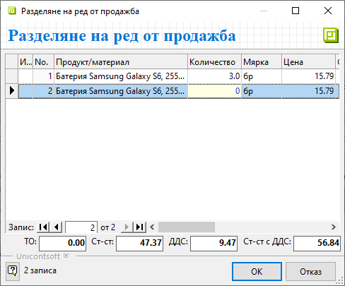 Системата разполага с инструмент за разделяне на вече въведен ред в документ за продажба.
