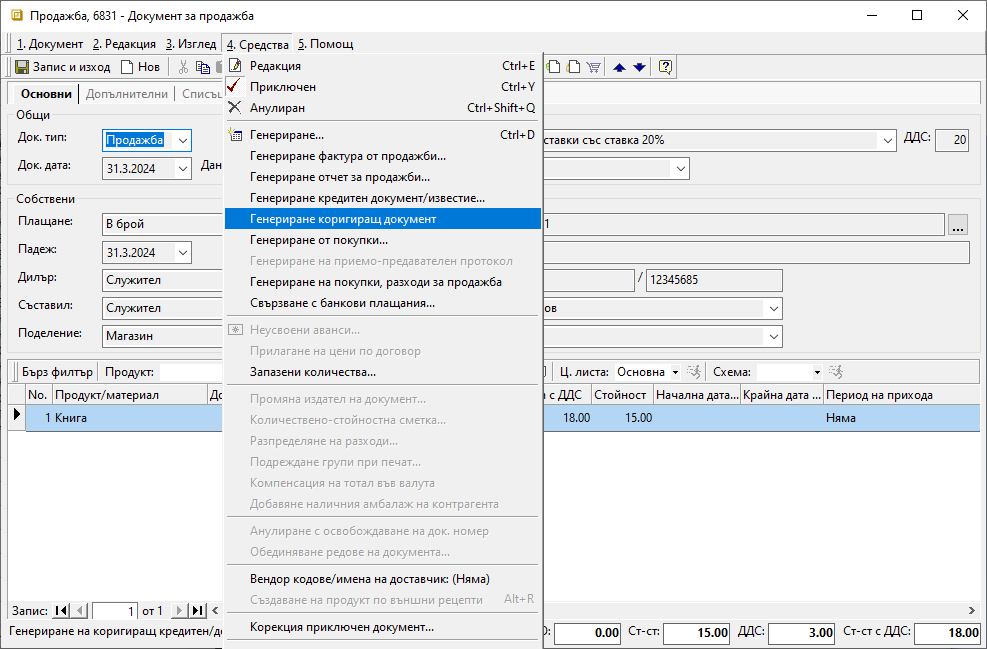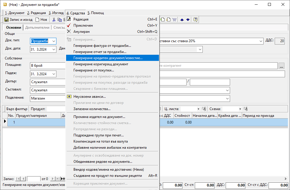 Ако създавате кредитен документ към една продажба, най-лесно е да използвате опцията Генериране коригиращ документ, която се намира в меню Средства в самата продажба. Така системата създава копие на документа за продажба, но с отрицателен знак.