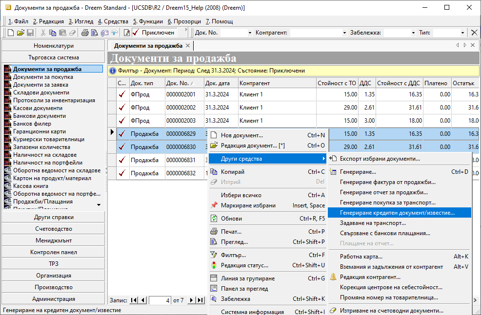 Генерацията на кредитен документ от списъка с документи предполага да филтрирате така документите в него, че желаните продажби да са лесни за маркиране. След което с десен бутон на мишката върху маркировката избирате Други средства » Генериране на кредитен документ/известие и следвате стъпките.