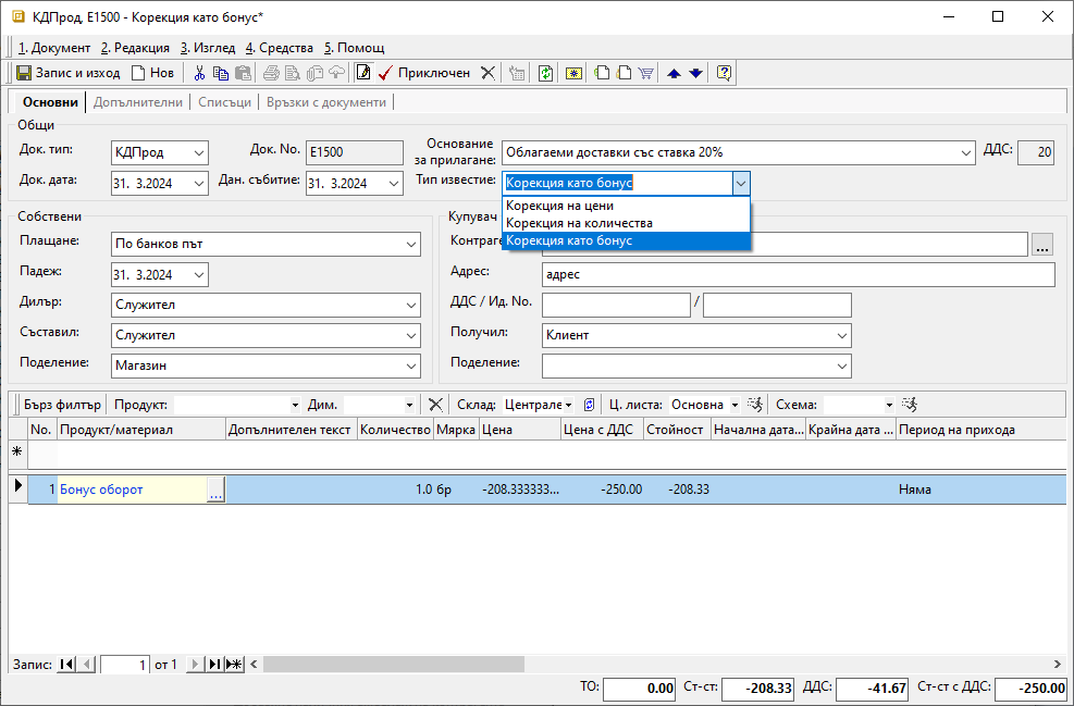 Документ от тип Корекция като бонус се създава единствено чрез Нов документ, в който ръчно обзавеждате всички реквизити.