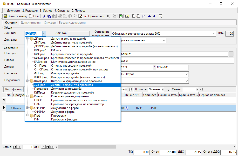 Генерацията на дебитните документи в системата следва същите стъпки, които разгледахме за кредитни документи. Тъй като така се генерират коригиращи документи с отрицателен знак, задължително трябва да смените Док. тип.