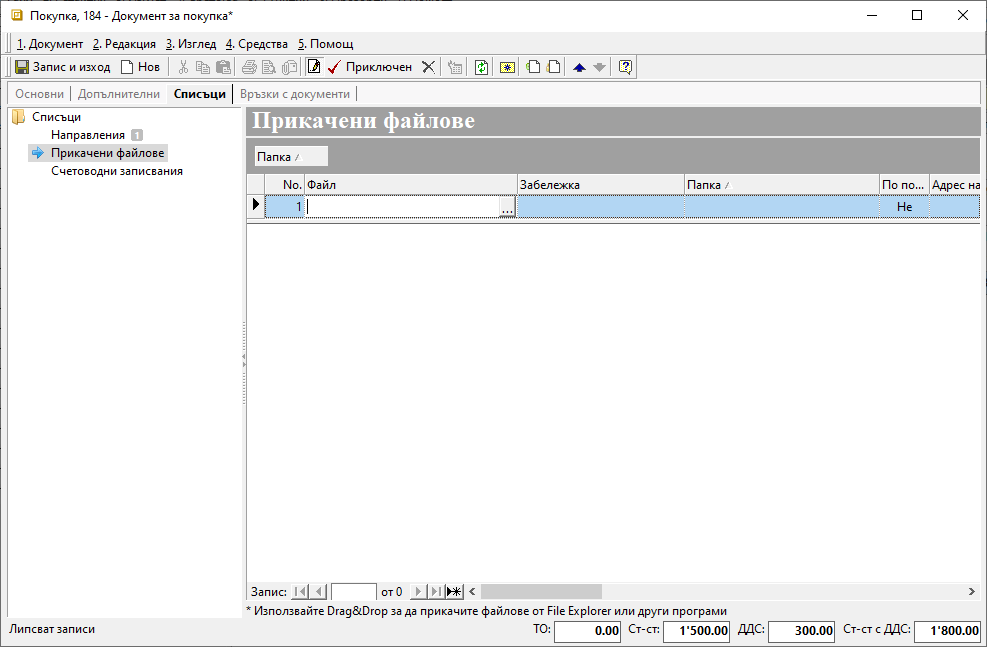 Типовете документи, в които можете да добавите файл, са продажби, покупки, заявки, складови документи и договори. Във всеки един от тях опцията отново е налична в панел Списъци.