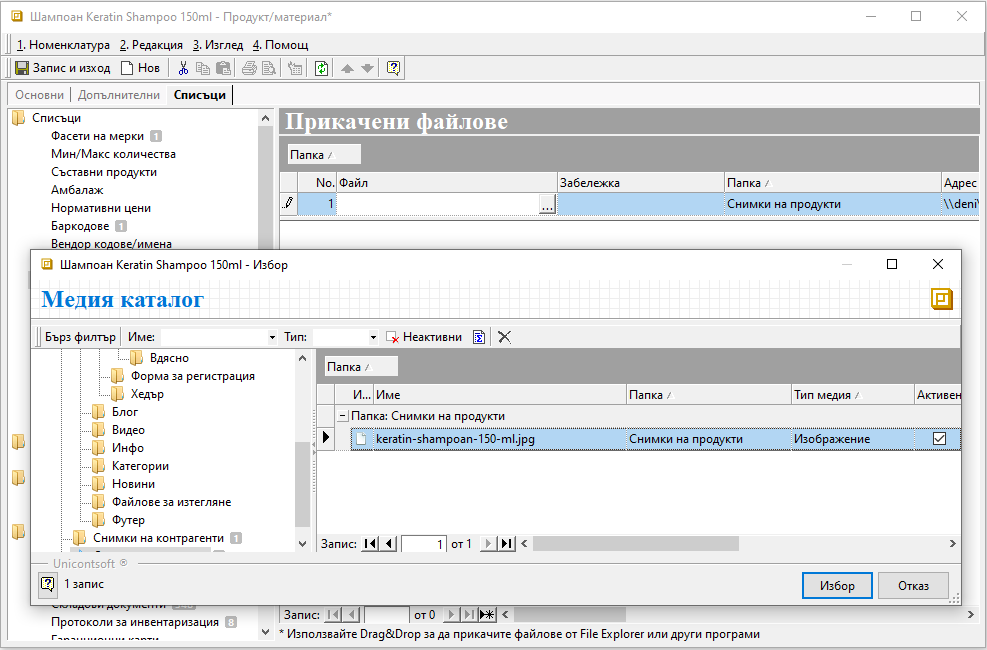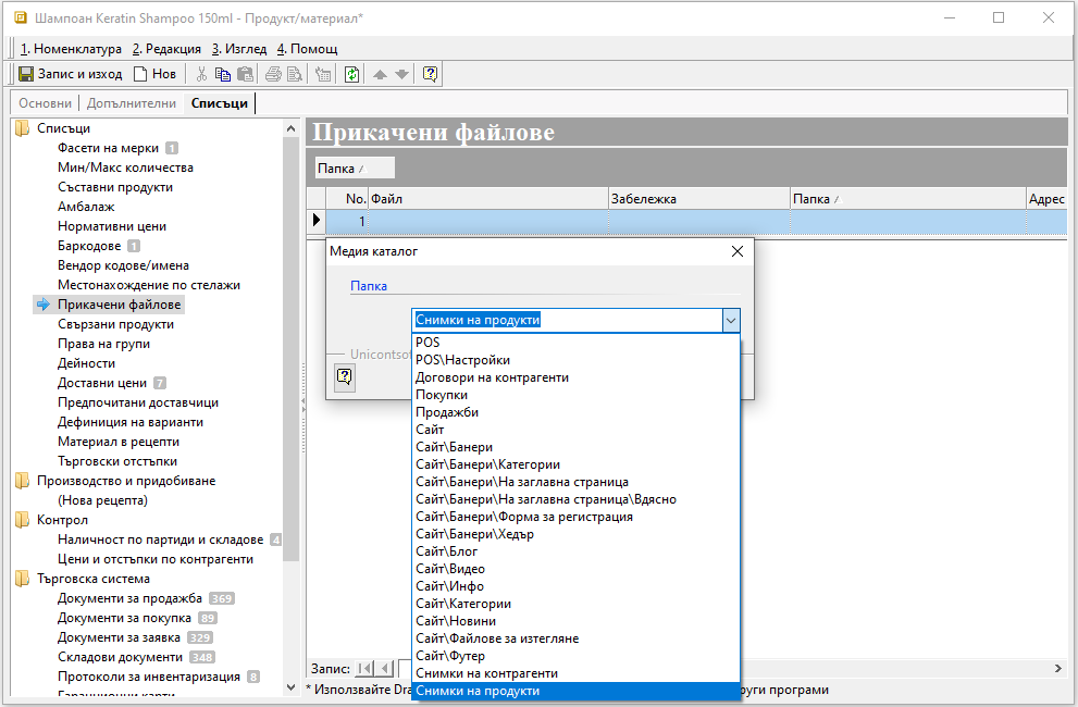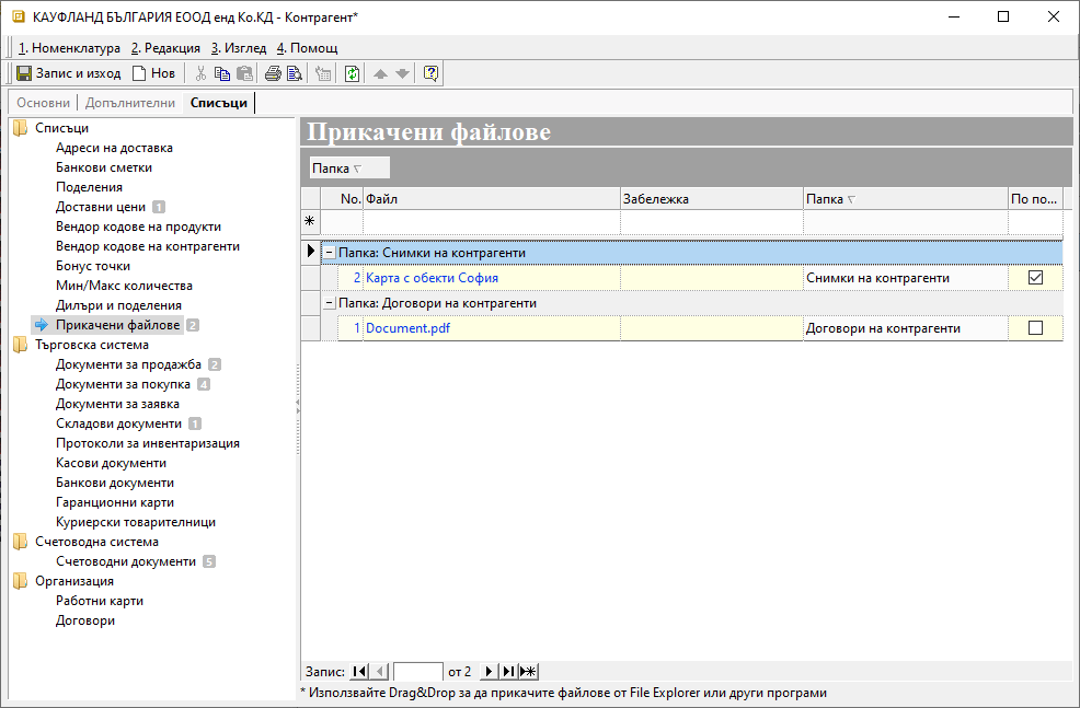 Промените трябва да бъдат записани, след което файлове ще са достъпни за прикачване в Контрагенти, Продукти и материали, както и в някои документи.