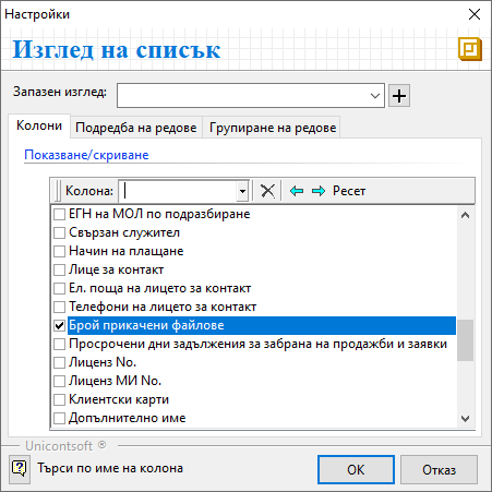 В списък Контрагенти системата дава информация за общо прикачените файлове за всеки един контрагент. За целта трябва да изведете колона Брой прикачени файлове.