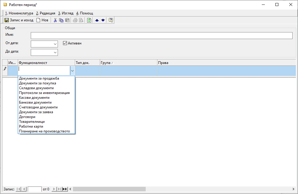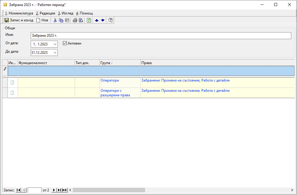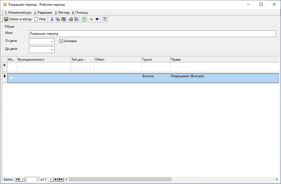 Още при стартиране на работа със системата задължително е настроен разрешителен работен период. Най-удачно е той да бъде настроен общо за всички групи потребители като безсрочен.