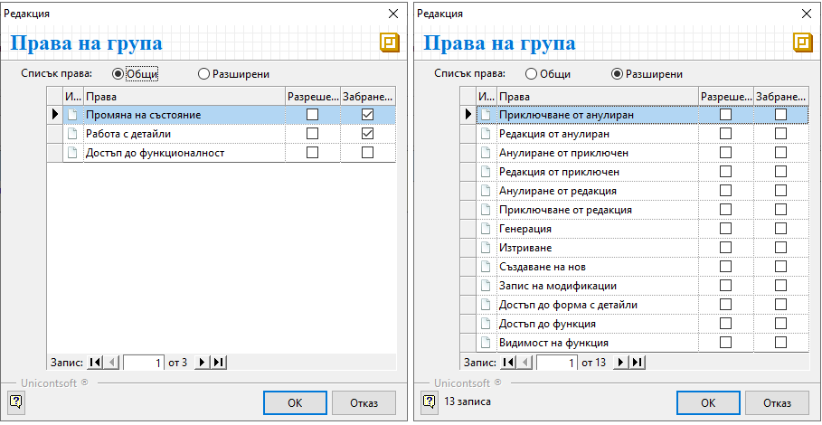 Права - В полето от тази колона отваряте форма за редакция Права на групи. Имате два изгледа на опциите, участващите в списъка - Общи и Разширени. Именно тук, маркирайки с Разрешени или Забранени*, конфигурирате ограниченията. За прецизна настройка на действията, които ще се разрешават/забраняват, използвайте изглед Разширени.