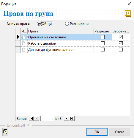 Избраните ограничения за промяна на състояние и работа с детайли в продажби посочвате в колоната Права. Във формата за редакция, която ще отворите от полето, маркирайте съответните опции със Забранени.