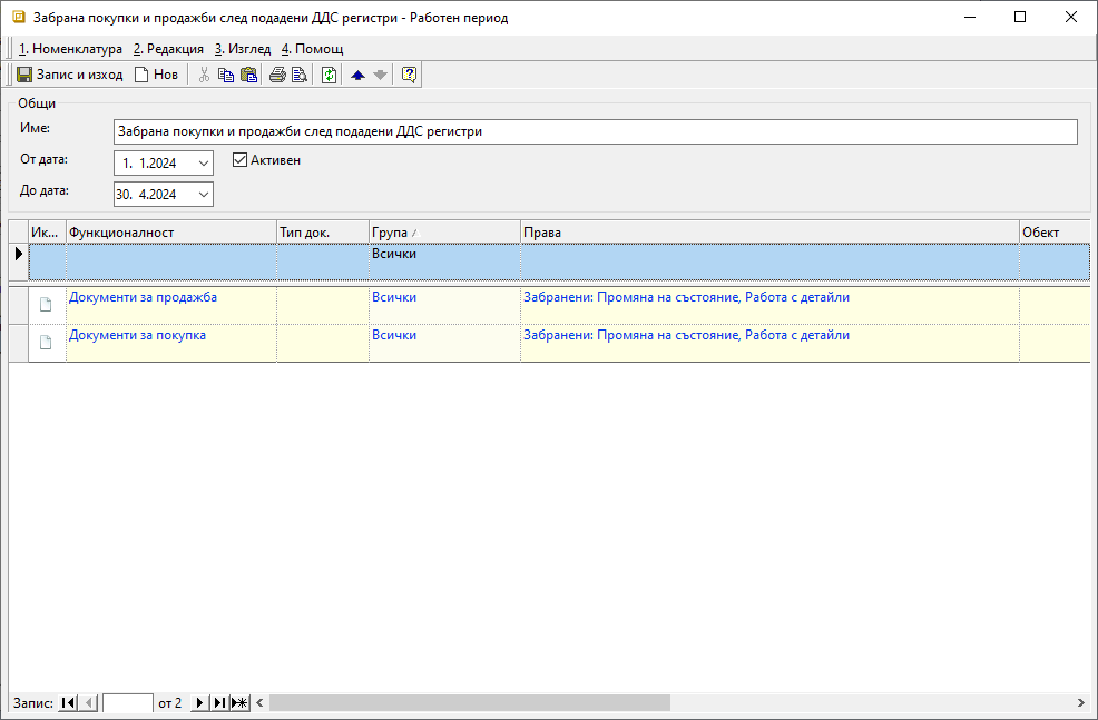 Аналогично, при настроена крайна дата, създаване/редакция на документи с последваща дата не е възможно.