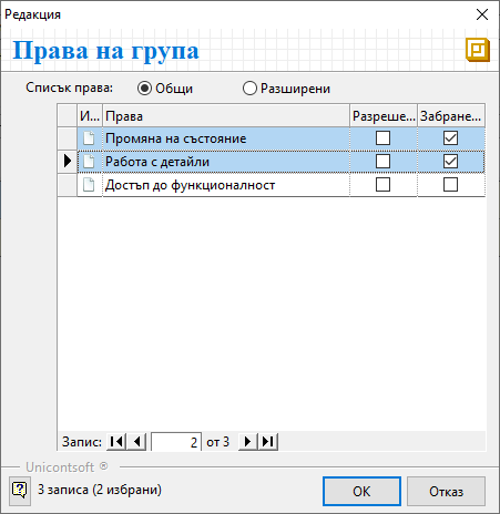 За целите на текущия пример раздел Общи е по-удобен. Достатъчно е да маркирате първите две опции - Промяна на състояние и Работа с детайли, след което потвърдете настройките.