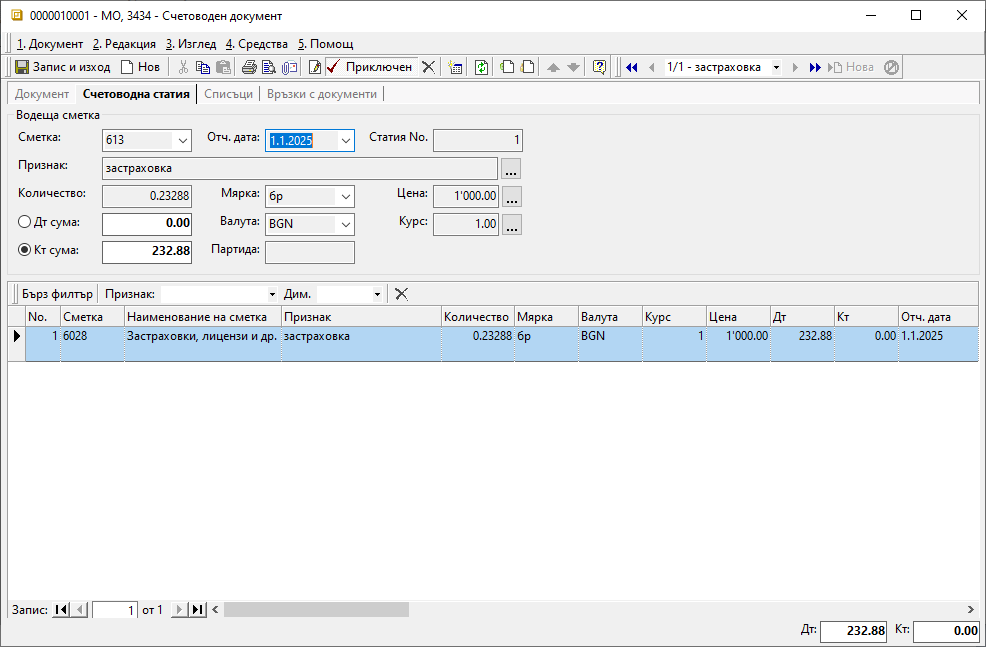 В скачения счетоводен документ МО сумата на застраховката за 2025 г. се прехвърля от сметката за разходи за бъдещи периоди в настроената сметка за застраховки от гр.60. Отчетната дата е първият ден в 2025 г.