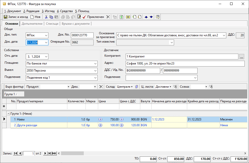 При въвеждане на фактурата в Док.дата записвате 03.01.2024. Другите разходи, участващи във фактурата, са в текущата календарна година, затова въвеждате без особености.