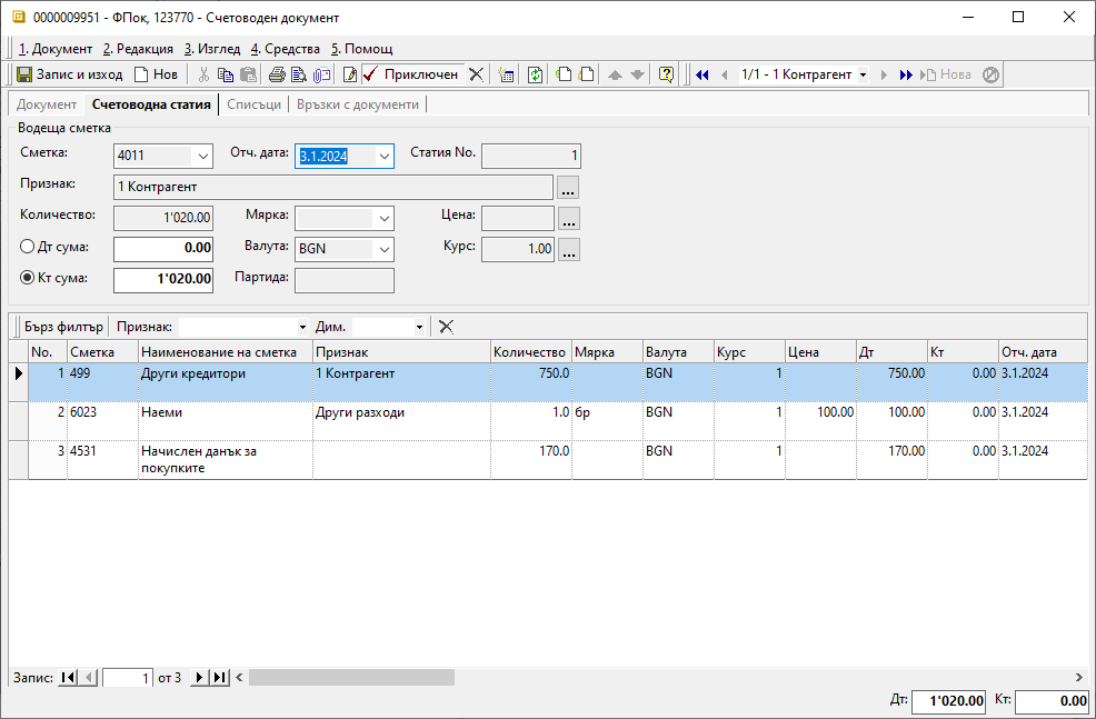 Основният счетоводен документ е с отчетна дата 03.01.2024 г. В него сумата на наема от декември е отразена в настроената за Сметка за разходи в минал период с/ка 499. Другите разходи са в текуща календарна година, затова се осчетоводяват в гр. 60 според настроения Сметкоплан.