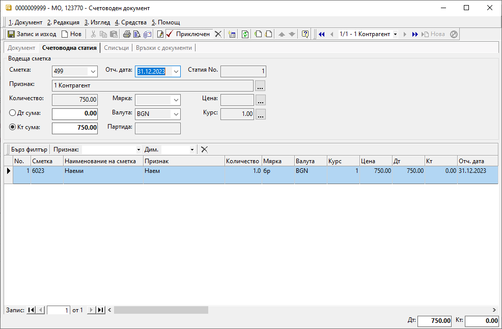 Скаченият документ МО съдържа отнасянето на сумата на наема по дебита в гр. 60 с отчетна дата 31.12.2023 г.
