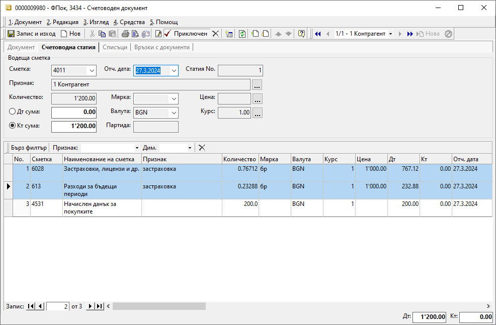 В основния счетоводен документ ФПок отчетната дата е 27.03.2024 г. Тук, спрямо избрания тип на разхода Годишен, системата е осчетоводила автоматично сумата за 2024 г. в настроената от гр.60 сметка в Сметкоплан. Оставащата за 2025 г. сума отива по сметката Разходи за бъдещи периоди, настроена в Администрация.