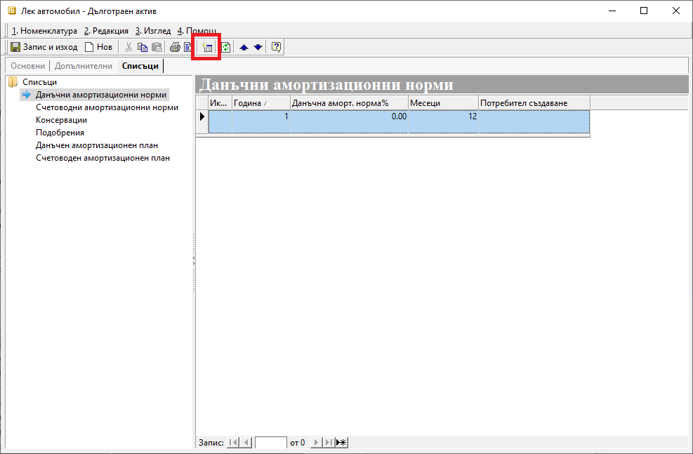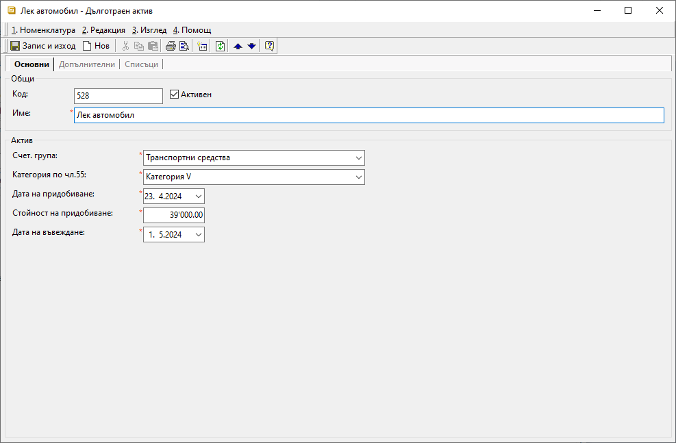 Нека въведем в системата един примерен актив - Лек автомобил, който попада в Категория V с амортизационната норма 25% на година.