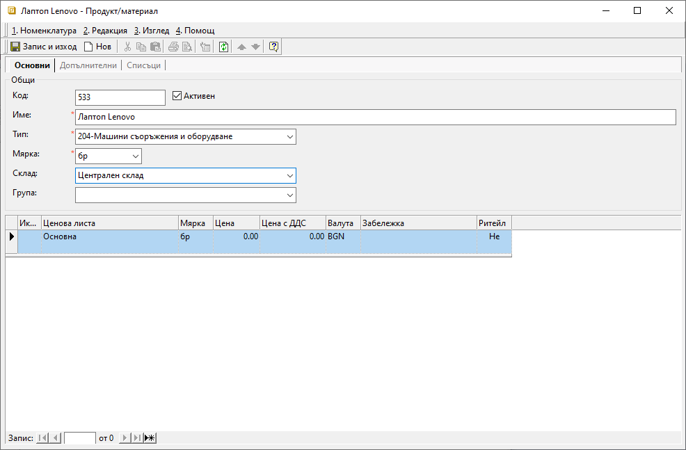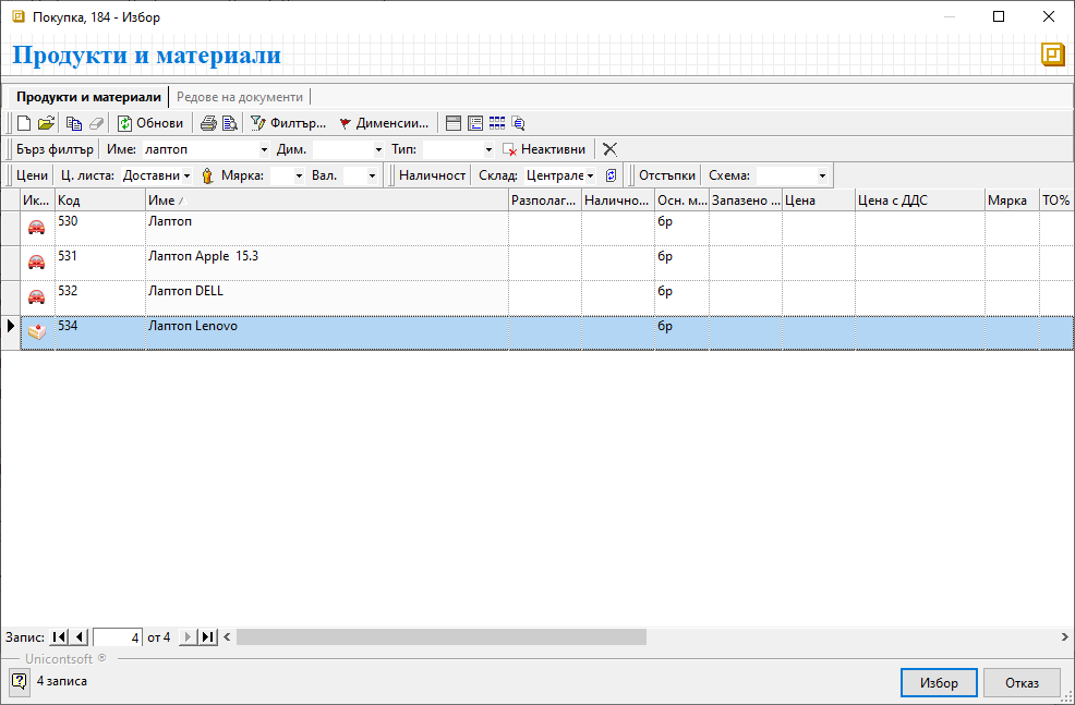 В списъка с продукти вече фигурира Лаптоп lenovo, като ще забележите разлика между неговата икона и тези на вече въведени ДА. Така системата разграничава номенклатурите, отговарящи на специфичните изисквания и настроени като ДА.