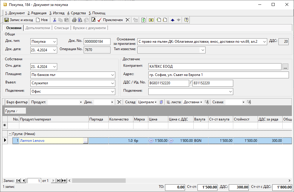 Ще покажем такова въвеждане на ДА с примерна фактура за покупка на лаптоп Lenovo на стойност 1800 лв.