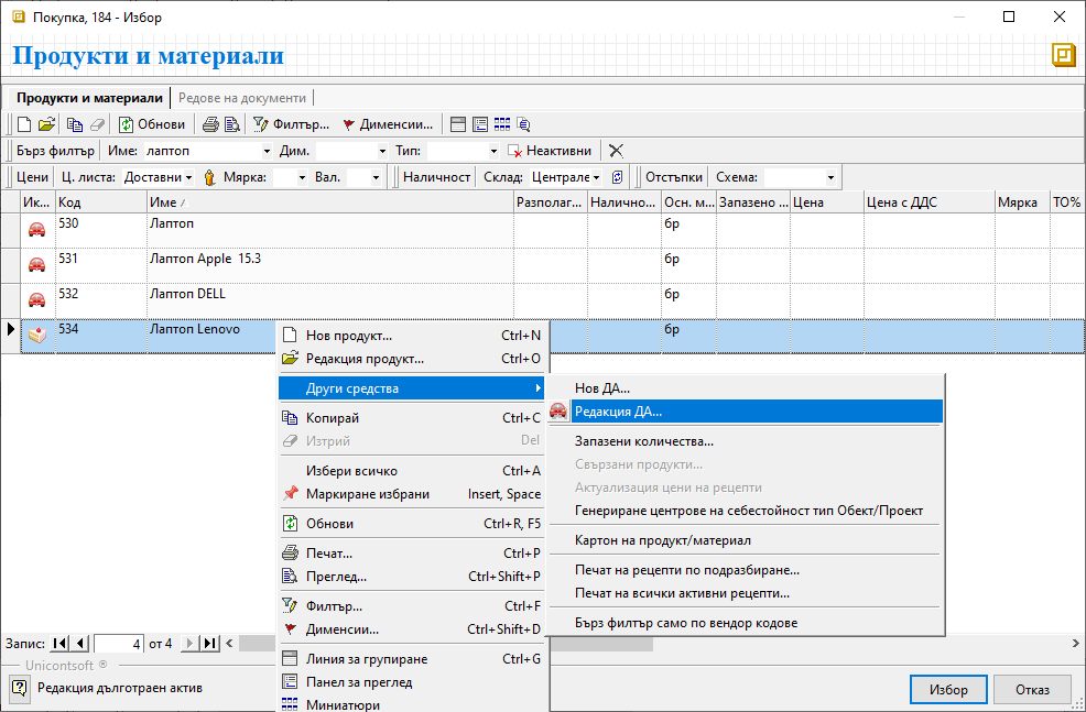 Това става от списък Продукти и материали. С десен бутон на мишката върху продукта избирате Други средства » Редакция ДА.