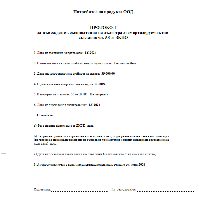 Системата дава възможност за печат на Протокол за въвеждане в експлоатация на дълготраен амортизируем актив, съгл. чл. 58 от ЗКПО.