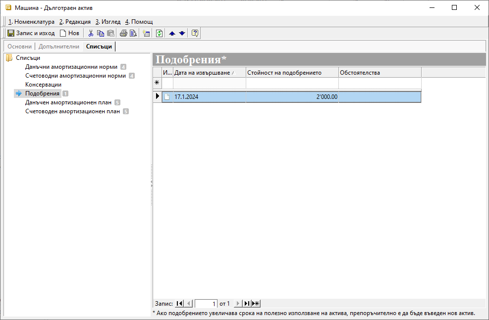 В системата сумата на извършените разходи се посочва в поле Стойност, избира се и Дата на подобрението. Настройките ще откриете в картон на ДА, панел Списъци » Подобрения.
