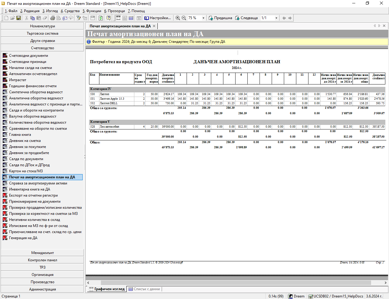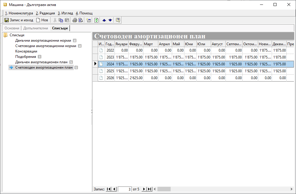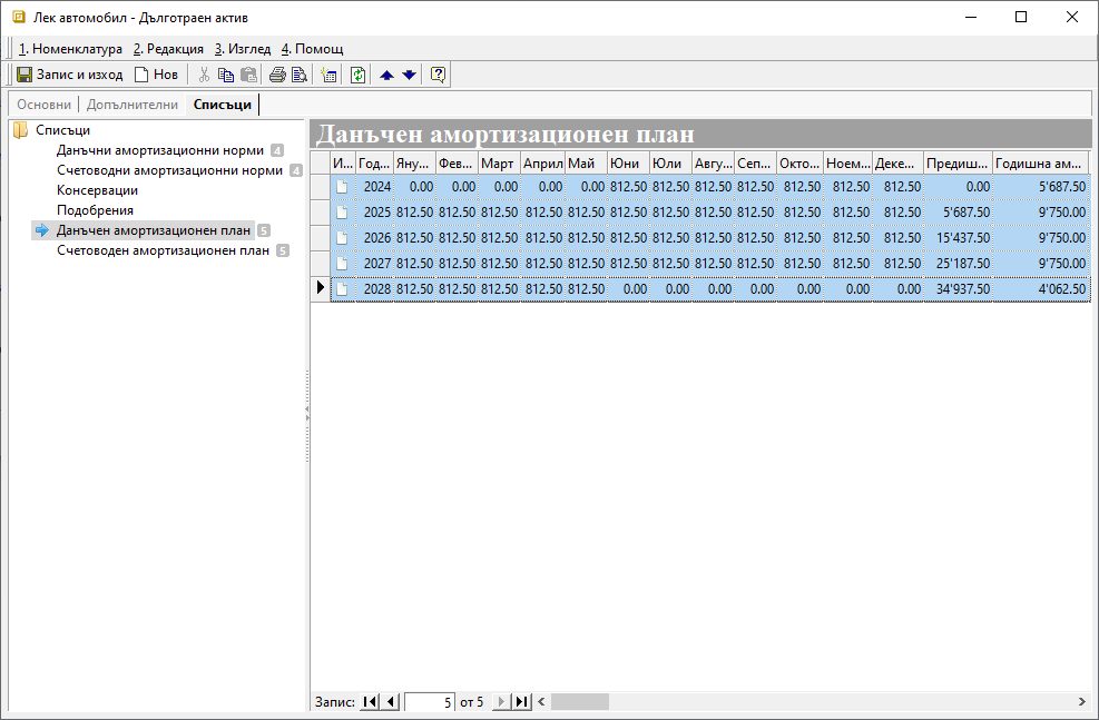 Генерираните в системата амортизационни планове могат да бъдат видени отделно за всеки актив. Както споменахме, това става във формата за редакция на избрания ДА.