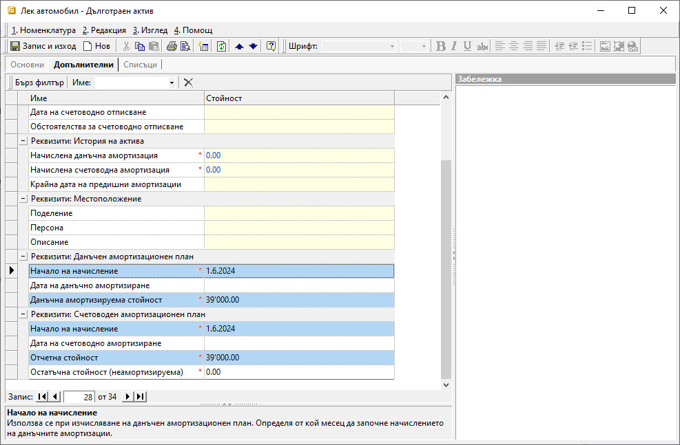 В Допълнителни системата е попълнила автоматично задължителните полета, свързани с данъчния и със счетоводния амортизационен план.