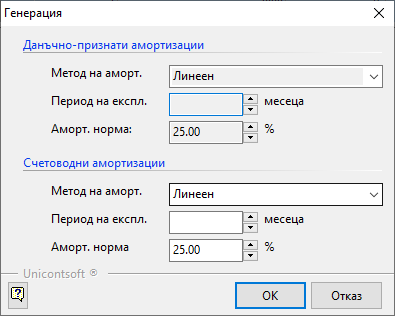 Използвайки бутона [Генериране] в лентата с инструменти ще изберете амортизационна норма (или период на експлоатация) и метод на амортизация.