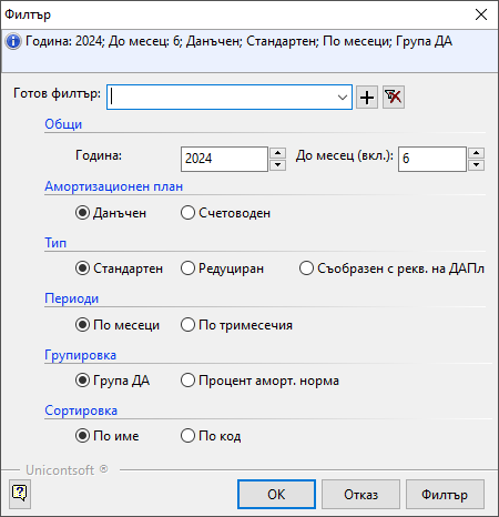Във филтъра може да изберете вида и типа на амортизационния план, период и други.