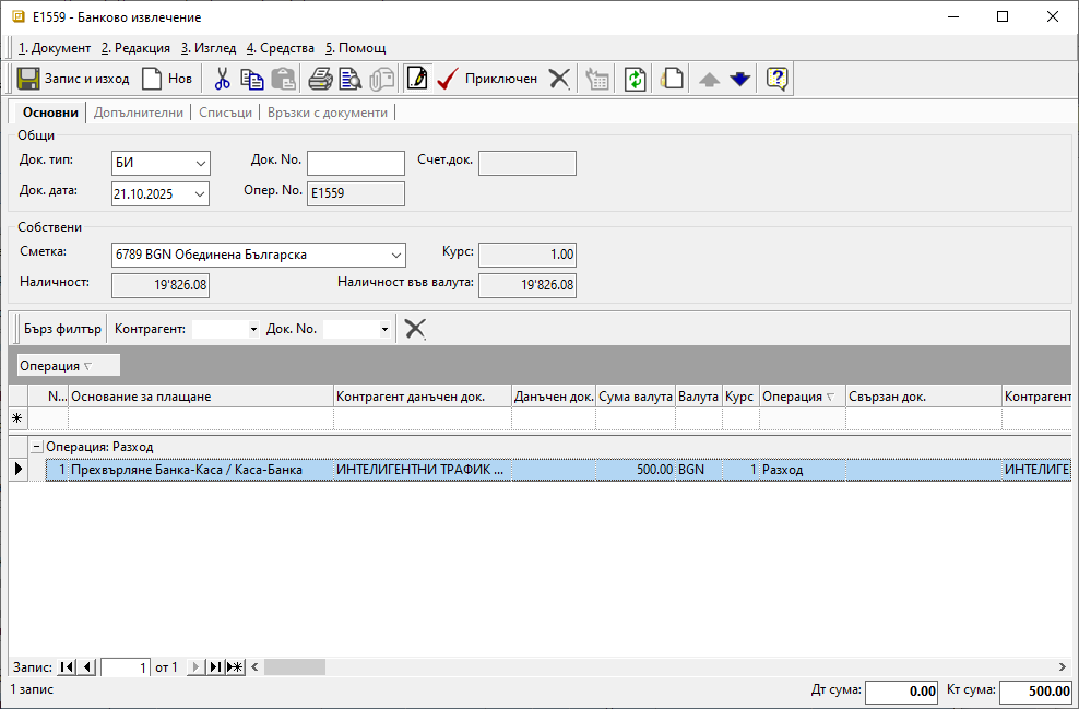 Банково извлечение - За авансово платената сума на доставчик регистрирате трансфер от избрана банкова сметка, с който да захраните касата за разчети за тол такси.