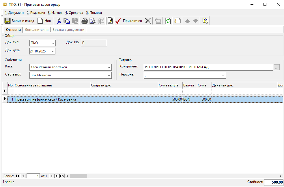 Приходен касов документ - За получения трансфер от банковата сметка въвеждате ПКО-Приходен касов документ в новата каса за разчети за тол такси.