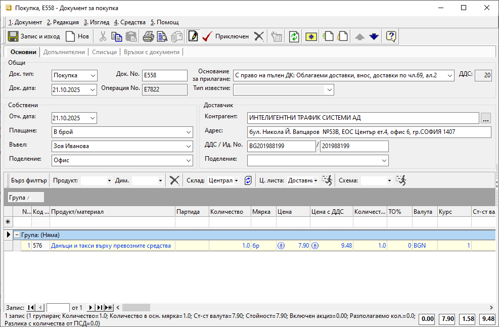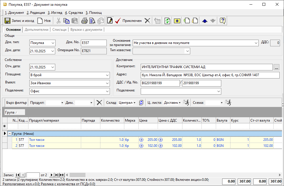 Към покупката трябва да има фактура, която не участва в дневниците по ДДС. Затова в Основание за прилагане избирате такова, настроено с 0% ДДС ставка (напр. Не участва в дневник на покупките). Този документ се създава единствено за целите на вътрешнофирменото отчитане.